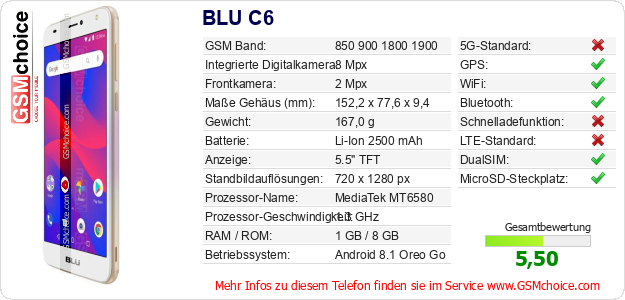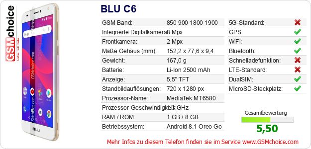 Hast du eigene Webseite? Willst du die Informationen über Standarddaten des Handys BLU C6 irgendwo veröffentlichen? Das ist sehr einfach. Du kannst das Bild herunterladen oder kopieren und auf der Webseite folgenden Code hinzufügen:Das Einfügen von diesem Code verursacht das Anzeigen von dem folgenden Bild: