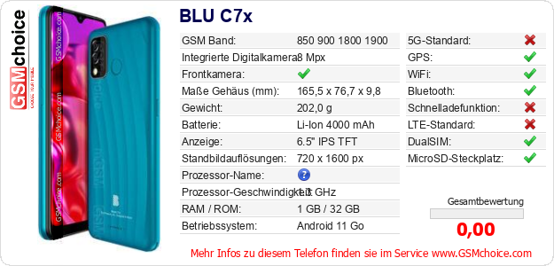 Hast du eigene Webseite? Willst du die Informationen über Standarddaten des Handys BLU C7x irgendwo veröffentlichen? Das ist sehr einfach. Du kannst das Bild herunterladen oder kopieren und auf der Webseite folgenden Code hinzufügen:Das Einfügen von diesem Code verursacht das Anzeigen von dem folgenden Bild: