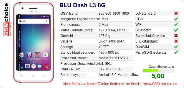 Hast du eigene Webseite? Willst du die Informationen über Standarddaten des Handys BLU Dash L3 8G irgendwo veröffentlichen? Das ist sehr einfach. Du kannst das Bild herunterladen oder kopieren und auf der Webseite folgenden Code hinzufügen:Das Einfügen von diesem Code verursacht das Anzeigen von dem folgenden Bild: