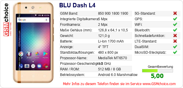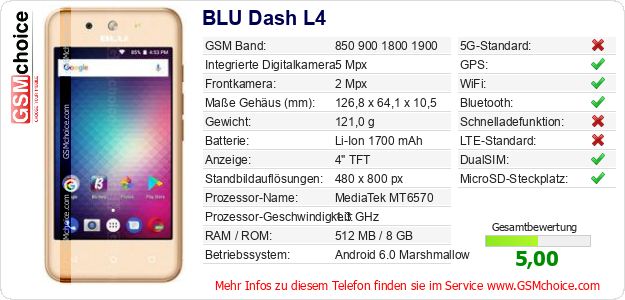 Hast du eigene Webseite? Willst du die Informationen über Standarddaten des Handys BLU Dash L4 irgendwo veröffentlichen? Das ist sehr einfach. Du kannst das Bild herunterladen oder kopieren und auf der Webseite folgenden Code hinzufügen:Das Einfügen von diesem Code verursacht das Anzeigen von dem folgenden Bild: