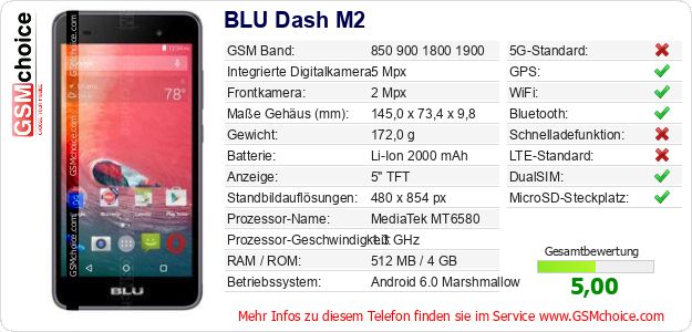 Hast du eigene Webseite? Willst du die Informationen über Standarddaten des Handys BLU Dash M2 irgendwo veröffentlichen? Das ist sehr einfach. Du kannst das Bild herunterladen oder kopieren und auf der Webseite folgenden Code hinzufügen:Das Einfügen von diesem Code verursacht das Anzeigen von dem folgenden Bild: