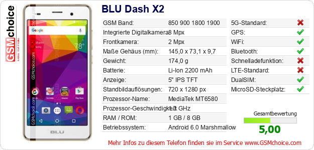 Hast du eigene Webseite? Willst du die Informationen über Standarddaten des Handys BLU Dash X2 irgendwo veröffentlichen? Das ist sehr einfach. Du kannst das Bild herunterladen oder kopieren und auf der Webseite folgenden Code hinzufügen:Das Einfügen von diesem Code verursacht das Anzeigen von dem folgenden Bild:
