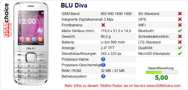 Hast du eigene Webseite? Willst du die Informationen über Standarddaten des Handys BLU Diva irgendwo veröffentlichen? Das ist sehr einfach. Du kannst das Bild herunterladen oder kopieren und auf der Webseite folgenden Code hinzufügen:Das Einfügen von diesem Code verursacht das Anzeigen von dem folgenden Bild:
