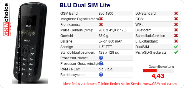Hast du eigene Webseite? Willst du die Informationen über Standarddaten des Handys BLU Dual SIM Lite irgendwo veröffentlichen? Das ist sehr einfach. Du kannst das Bild herunterladen oder kopieren und auf der Webseite folgenden Code hinzufügen:Das Einfügen von diesem Code verursacht das Anzeigen von dem folgenden Bild: