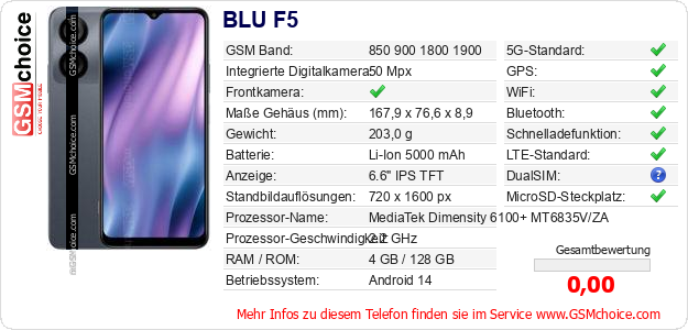 Hast du eigene Webseite? Willst du die Informationen über Standarddaten des Handys BLU F5 irgendwo veröffentlichen? Das ist sehr einfach. Du kannst das Bild herunterladen oder kopieren und auf der Webseite folgenden Code hinzufügen:Das Einfügen von diesem Code verursacht das Anzeigen von dem folgenden Bild: