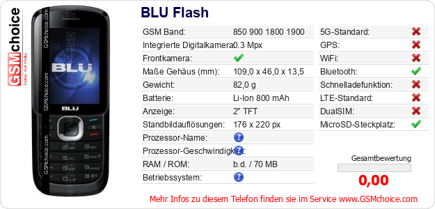 Hast du eigene Webseite? Willst du die Informationen über Standarddaten des Handys BLU Flash irgendwo veröffentlichen? Das ist sehr einfach. Du kannst das Bild herunterladen oder kopieren und auf der Webseite folgenden Code hinzufügen:Das Einfügen von diesem Code verursacht das Anzeigen von dem folgenden Bild: