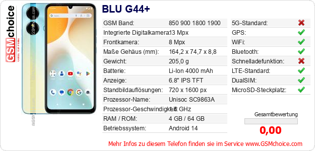 Hast du eigene Webseite? Willst du die Informationen über Standarddaten des Handys BLU G44+ irgendwo veröffentlichen? Das ist sehr einfach. Du kannst das Bild herunterladen oder kopieren und auf der Webseite folgenden Code hinzufügen:Das Einfügen von diesem Code verursacht das Anzeigen von dem folgenden Bild: