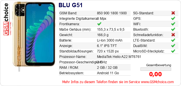 Hast du eigene Webseite? Willst du die Informationen über Standarddaten des Handys BLU G51 irgendwo veröffentlichen? Das ist sehr einfach. Du kannst das Bild herunterladen oder kopieren und auf der Webseite folgenden Code hinzufügen:Das Einfügen von diesem Code verursacht das Anzeigen von dem folgenden Bild: