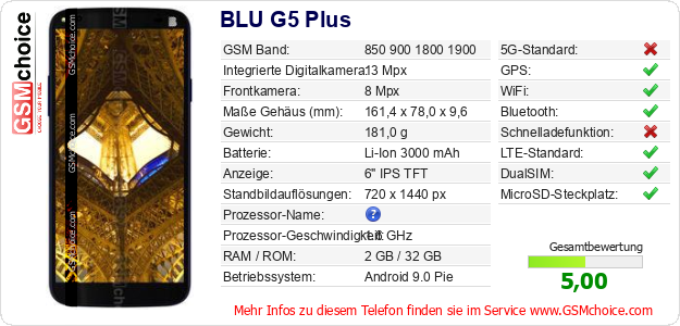 Hast du eigene Webseite? Willst du die Informationen über Standarddaten des Handys BLU G5 Plus irgendwo veröffentlichen? Das ist sehr einfach. Du kannst das Bild herunterladen oder kopieren und auf der Webseite folgenden Code hinzufügen:Das Einfügen von diesem Code verursacht das Anzeigen von dem folgenden Bild: