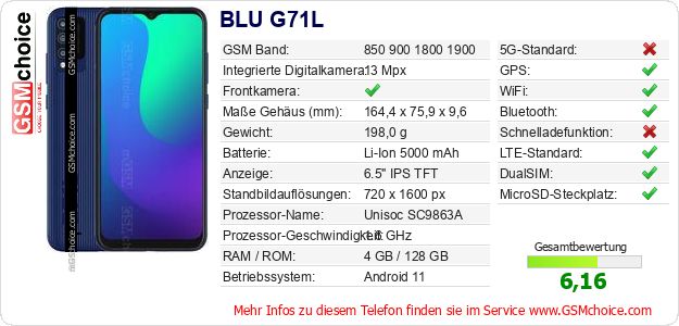 Hast du eigene Webseite? Willst du die Informationen über Standarddaten des Handys BLU G71L irgendwo veröffentlichen? Das ist sehr einfach. Du kannst das Bild herunterladen oder kopieren und auf der Webseite folgenden Code hinzufügen:Das Einfügen von diesem Code verursacht das Anzeigen von dem folgenden Bild: