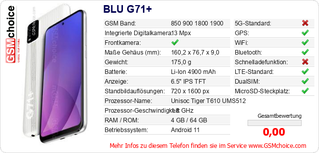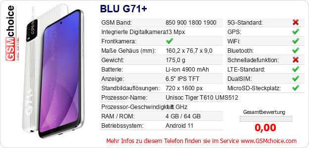 Hast du eigene Webseite? Willst du die Informationen über Standarddaten des Handys BLU G71+ irgendwo veröffentlichen? Das ist sehr einfach. Du kannst das Bild herunterladen oder kopieren und auf der Webseite folgenden Code hinzufügen:Das Einfügen von diesem Code verursacht das Anzeigen von dem folgenden Bild: