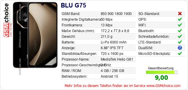 Hast du eigene Webseite? Willst du die Informationen über Standarddaten des Handys BLU G75 irgendwo veröffentlichen? Das ist sehr einfach. Du kannst das Bild herunterladen oder kopieren und auf der Webseite folgenden Code hinzufügen:Das Einfügen von diesem Code verursacht das Anzeigen von dem folgenden Bild: