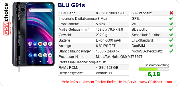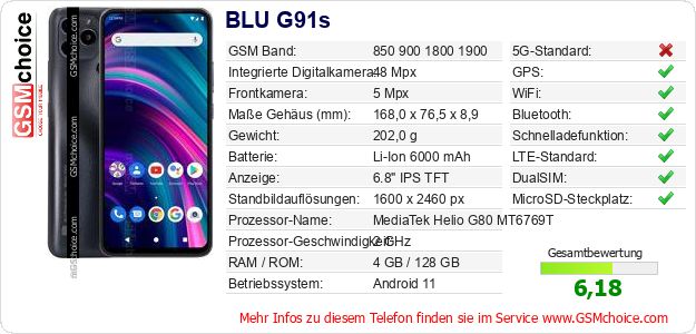 Hast du eigene Webseite? Willst du die Informationen über Standarddaten des Handys BLU G91s irgendwo veröffentlichen? Das ist sehr einfach. Du kannst das Bild herunterladen oder kopieren und auf der Webseite folgenden Code hinzufügen:Das Einfügen von diesem Code verursacht das Anzeigen von dem folgenden Bild:
