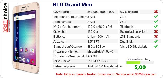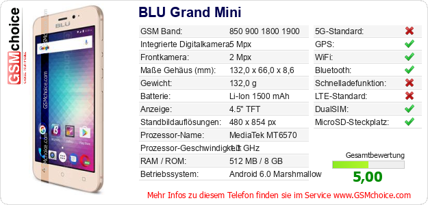Hast du eigene Webseite? Willst du die Informationen über Standarddaten des Handys BLU Grand Mini irgendwo veröffentlichen? Das ist sehr einfach. Du kannst das Bild herunterladen oder kopieren und auf der Webseite folgenden Code hinzufügen:Das Einfügen von diesem Code verursacht das Anzeigen von dem folgenden Bild: