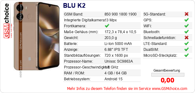 Hast du eigene Webseite? Willst du die Informationen über Standarddaten des Handys BLU K2 irgendwo veröffentlichen? Das ist sehr einfach. Du kannst das Bild herunterladen oder kopieren und auf der Webseite folgenden Code hinzufügen:Das Einfügen von diesem Code verursacht das Anzeigen von dem folgenden Bild: