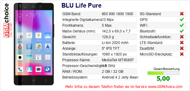Hast du eigene Webseite? Willst du die Informationen über Standarddaten des Handys BLU Life Pure irgendwo veröffentlichen? Das ist sehr einfach. Du kannst das Bild herunterladen oder kopieren und auf der Webseite folgenden Code hinzufügen:Das Einfügen von diesem Code verursacht das Anzeigen von dem folgenden Bild: