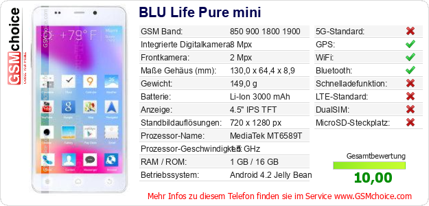 Hast du eigene Webseite? Willst du die Informationen über Standarddaten des Handys BLU Life Pure mini irgendwo veröffentlichen? Das ist sehr einfach. Du kannst das Bild herunterladen oder kopieren und auf der Webseite folgenden Code hinzufügen:Das Einfügen von diesem Code verursacht das Anzeigen von dem folgenden Bild: