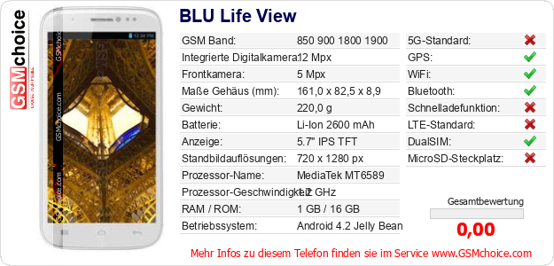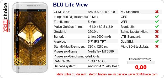 Hast du eigene Webseite? Willst du die Informationen über Standarddaten des Handys BLU Life View irgendwo veröffentlichen? Das ist sehr einfach. Du kannst das Bild herunterladen oder kopieren und auf der Webseite folgenden Code hinzufügen:Das Einfügen von diesem Code verursacht das Anzeigen von dem folgenden Bild: