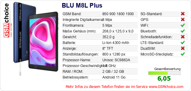 Hast du eigene Webseite? Willst du die Informationen über Standarddaten des Handys BLU M8L Plus irgendwo veröffentlichen? Das ist sehr einfach. Du kannst das Bild herunterladen oder kopieren und auf der Webseite folgenden Code hinzufügen:Das Einfügen von diesem Code verursacht das Anzeigen von dem folgenden Bild: