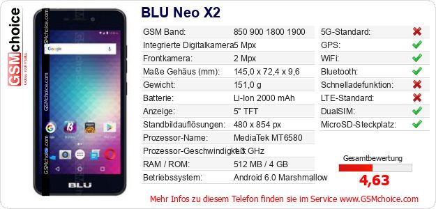 Hast du eigene Webseite? Willst du die Informationen über Standarddaten des Handys BLU Neo X2 irgendwo veröffentlichen? Das ist sehr einfach. Du kannst das Bild herunterladen oder kopieren und auf der Webseite folgenden Code hinzufügen:Das Einfügen von diesem Code verursacht das Anzeigen von dem folgenden Bild: