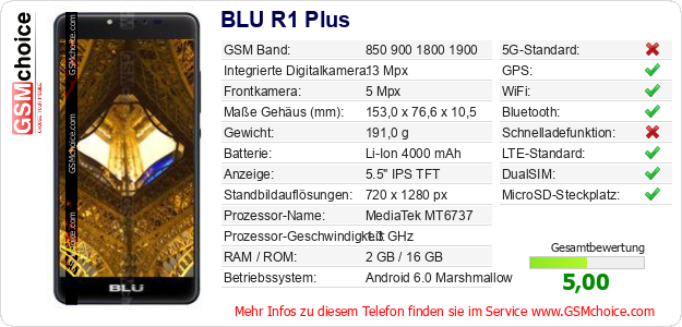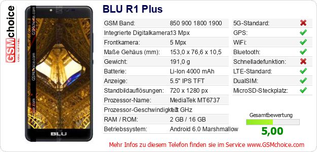 Hast du eigene Webseite? Willst du die Informationen über Standarddaten des Handys BLU R1 Plus irgendwo veröffentlichen? Das ist sehr einfach. Du kannst das Bild herunterladen oder kopieren und auf der Webseite folgenden Code hinzufügen:Das Einfügen von diesem Code verursacht das Anzeigen von dem folgenden Bild: