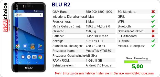 Hast du eigene Webseite? Willst du die Informationen über Standarddaten des Handys BLU R2 irgendwo veröffentlichen? Das ist sehr einfach. Du kannst das Bild herunterladen oder kopieren und auf der Webseite folgenden Code hinzufügen:Das Einfügen von diesem Code verursacht das Anzeigen von dem folgenden Bild: