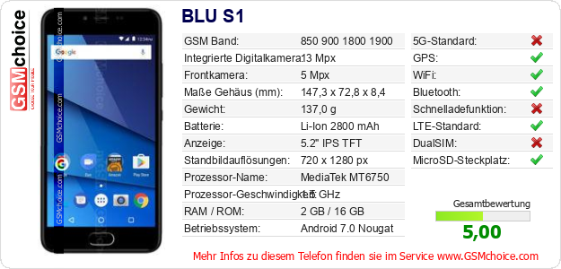 Hast du eigene Webseite? Willst du die Informationen über Standarddaten des Handys BLU S1 irgendwo veröffentlichen? Das ist sehr einfach. Du kannst das Bild herunterladen oder kopieren und auf der Webseite folgenden Code hinzufügen:Das Einfügen von diesem Code verursacht das Anzeigen von dem folgenden Bild: