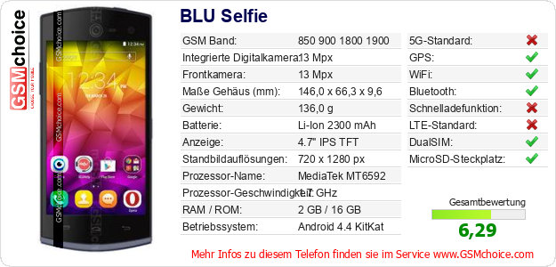 Hast du eigene Webseite? Willst du die Informationen über Standarddaten des Handys BLU Selfie irgendwo veröffentlichen? Das ist sehr einfach. Du kannst das Bild herunterladen oder kopieren und auf der Webseite folgenden Code hinzufügen:Das Einfügen von diesem Code verursacht das Anzeigen von dem folgenden Bild: