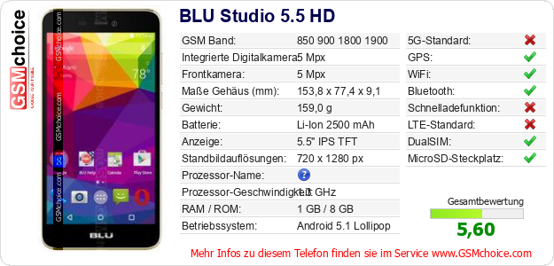 Hast du eigene Webseite? Willst du die Informationen über Standarddaten des Handys BLU Studio 5.5 HD irgendwo veröffentlichen? Das ist sehr einfach. Du kannst das Bild herunterladen oder kopieren und auf der Webseite folgenden Code hinzufügen:Das Einfügen von diesem Code verursacht das Anzeigen von dem folgenden Bild: