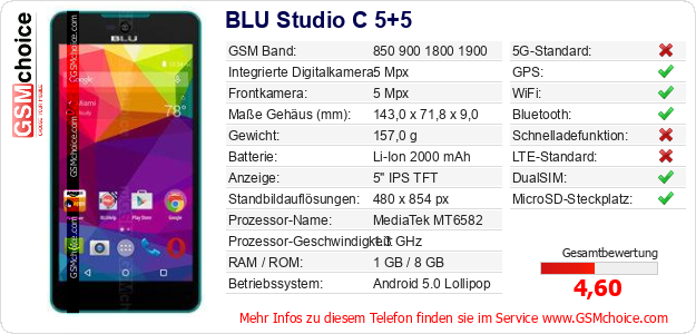 Hast du eigene Webseite? Willst du die Informationen über Standarddaten des Handys BLU Studio C 5+5 irgendwo veröffentlichen? Das ist sehr einfach. Du kannst das Bild herunterladen oder kopieren und auf der Webseite folgenden Code hinzufügen:Das Einfügen von diesem Code verursacht das Anzeigen von dem folgenden Bild:
