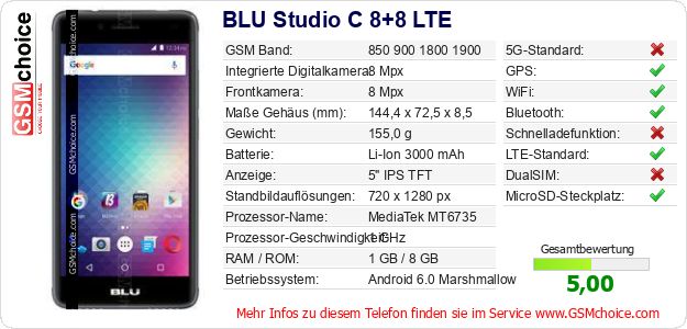 Hast du eigene Webseite? Willst du die Informationen über Standarddaten des Handys BLU Studio C 8+8 LTE irgendwo veröffentlichen? Das ist sehr einfach. Du kannst das Bild herunterladen oder kopieren und auf der Webseite folgenden Code hinzufügen:Das Einfügen von diesem Code verursacht das Anzeigen von dem folgenden Bild: