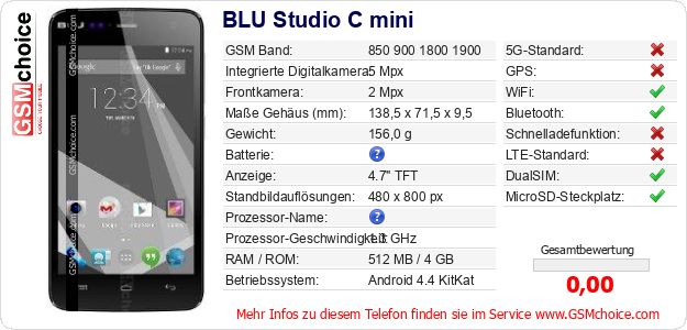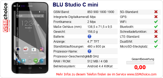 Hast du eigene Webseite? Willst du die Informationen über Standarddaten des Handys BLU Studio C mini irgendwo veröffentlichen? Das ist sehr einfach. Du kannst das Bild herunterladen oder kopieren und auf der Webseite folgenden Code hinzufügen:Das Einfügen von diesem Code verursacht das Anzeigen von dem folgenden Bild:
