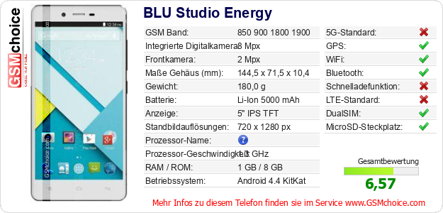 Hast du eigene Webseite? Willst du die Informationen über Standarddaten des Handys BLU Studio Energy irgendwo veröffentlichen? Das ist sehr einfach. Du kannst das Bild herunterladen oder kopieren und auf der Webseite folgenden Code hinzufügen:Das Einfügen von diesem Code verursacht das Anzeigen von dem folgenden Bild: