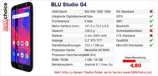 Hast du eigene Webseite? Willst du die Informationen über Standarddaten des Handys BLU Studio G4 irgendwo veröffentlichen? Das ist sehr einfach. Du kannst das Bild herunterladen oder kopieren und auf der Webseite folgenden Code hinzufügen:Das Einfügen von diesem Code verursacht das Anzeigen von dem folgenden Bild: