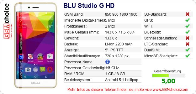Hast du eigene Webseite? Willst du die Informationen über Standarddaten des Handys BLU Studio G HD irgendwo veröffentlichen? Das ist sehr einfach. Du kannst das Bild herunterladen oder kopieren und auf der Webseite folgenden Code hinzufügen:Das Einfügen von diesem Code verursacht das Anzeigen von dem folgenden Bild: