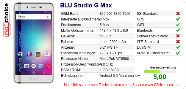 Hast du eigene Webseite? Willst du die Informationen über Standarddaten des Handys BLU Studio G Max irgendwo veröffentlichen? Das ist sehr einfach. Du kannst das Bild herunterladen oder kopieren und auf der Webseite folgenden Code hinzufügen:Das Einfügen von diesem Code verursacht das Anzeigen von dem folgenden Bild:
