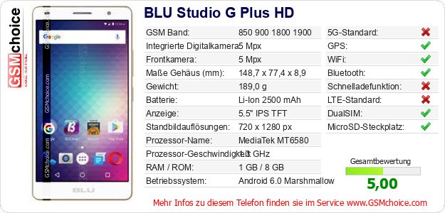 Hast du eigene Webseite? Willst du die Informationen über Standarddaten des Handys BLU Studio G Plus HD irgendwo veröffentlichen? Das ist sehr einfach. Du kannst das Bild herunterladen oder kopieren und auf der Webseite folgenden Code hinzufügen:Das Einfügen von diesem Code verursacht das Anzeigen von dem folgenden Bild: