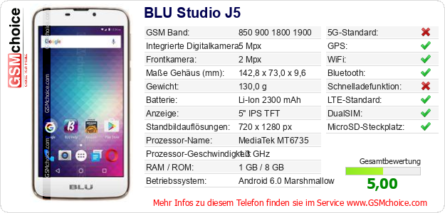 Hast du eigene Webseite? Willst du die Informationen über Standarddaten des Handys BLU Studio J5 irgendwo veröffentlichen? Das ist sehr einfach. Du kannst das Bild herunterladen oder kopieren und auf der Webseite folgenden Code hinzufügen:Das Einfügen von diesem Code verursacht das Anzeigen von dem folgenden Bild:
