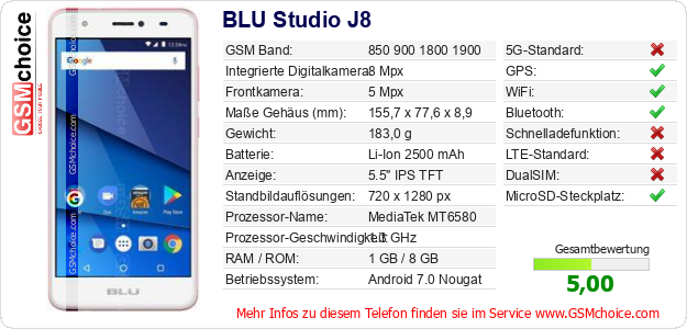 Hast du eigene Webseite? Willst du die Informationen über Standarddaten des Handys BLU Studio J8 irgendwo veröffentlichen? Das ist sehr einfach. Du kannst das Bild herunterladen oder kopieren und auf der Webseite folgenden Code hinzufügen:Das Einfügen von diesem Code verursacht das Anzeigen von dem folgenden Bild: