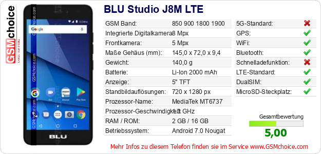 Hast du eigene Webseite? Willst du die Informationen über Standarddaten des Handys BLU Studio J8M LTE irgendwo veröffentlichen? Das ist sehr einfach. Du kannst das Bild herunterladen oder kopieren und auf der Webseite folgenden Code hinzufügen:Das Einfügen von diesem Code verursacht das Anzeigen von dem folgenden Bild: