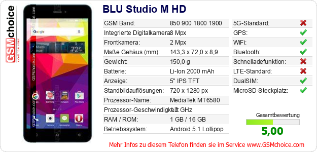 Hast du eigene Webseite? Willst du die Informationen über Standarddaten des Handys BLU Studio M HD irgendwo veröffentlichen? Das ist sehr einfach. Du kannst das Bild herunterladen oder kopieren und auf der Webseite folgenden Code hinzufügen:Das Einfügen von diesem Code verursacht das Anzeigen von dem folgenden Bild: