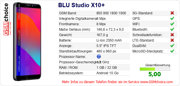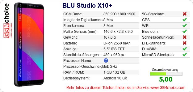 Hast du eigene Webseite? Willst du die Informationen über Standarddaten des Handys BLU Studio X10+ irgendwo veröffentlichen? Das ist sehr einfach. Du kannst das Bild herunterladen oder kopieren und auf der Webseite folgenden Code hinzufügen:Das Einfügen von diesem Code verursacht das Anzeigen von dem folgenden Bild: