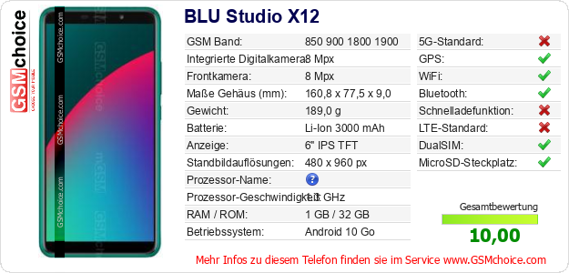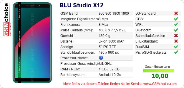 Hast du eigene Webseite? Willst du die Informationen über Standarddaten des Handys BLU Studio X12 irgendwo veröffentlichen? Das ist sehr einfach. Du kannst das Bild herunterladen oder kopieren und auf der Webseite folgenden Code hinzufügen:Das Einfügen von diesem Code verursacht das Anzeigen von dem folgenden Bild: