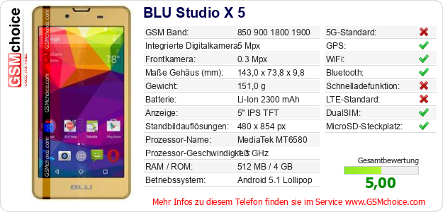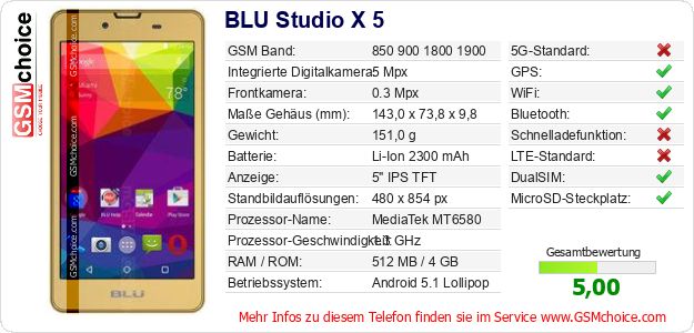 Hast du eigene Webseite? Willst du die Informationen über Standarddaten des Handys BLU Studio X 5 irgendwo veröffentlichen? Das ist sehr einfach. Du kannst das Bild herunterladen oder kopieren und auf der Webseite folgenden Code hinzufügen:Das Einfügen von diesem Code verursacht das Anzeigen von dem folgenden Bild: