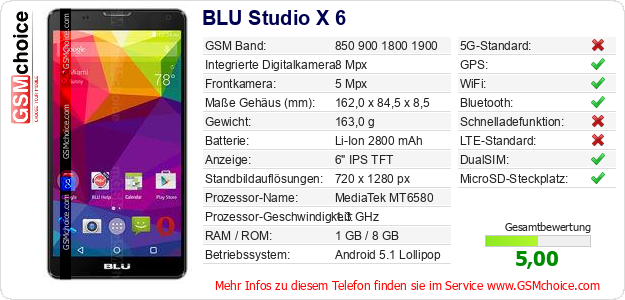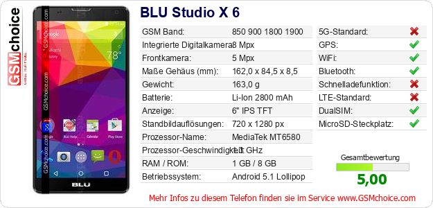 Hast du eigene Webseite? Willst du die Informationen über Standarddaten des Handys BLU Studio X 6 irgendwo veröffentlichen? Das ist sehr einfach. Du kannst das Bild herunterladen oder kopieren und auf der Webseite folgenden Code hinzufügen:Das Einfügen von diesem Code verursacht das Anzeigen von dem folgenden Bild:
