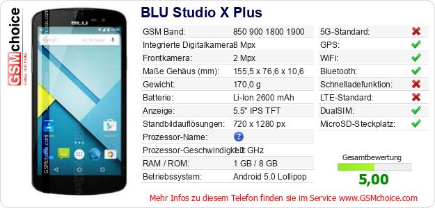 Hast du eigene Webseite? Willst du die Informationen über Standarddaten des Handys BLU Studio X Plus irgendwo veröffentlichen? Das ist sehr einfach. Du kannst das Bild herunterladen oder kopieren und auf der Webseite folgenden Code hinzufügen:Das Einfügen von diesem Code verursacht das Anzeigen von dem folgenden Bild: