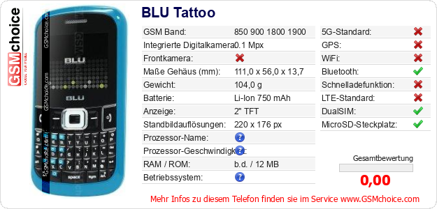 Hast du eigene Webseite? Willst du die Informationen über Standarddaten des Handys BLU Tattoo irgendwo veröffentlichen? Das ist sehr einfach. Du kannst das Bild herunterladen oder kopieren und auf der Webseite folgenden Code hinzufügen:Das Einfügen von diesem Code verursacht das Anzeigen von dem folgenden Bild: