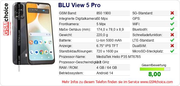 Hast du eigene Webseite? Willst du die Informationen über Standarddaten des Handys BLU View 5 Pro irgendwo veröffentlichen? Das ist sehr einfach. Du kannst das Bild herunterladen oder kopieren und auf der Webseite folgenden Code hinzufügen:Das Einfügen von diesem Code verursacht das Anzeigen von dem folgenden Bild: