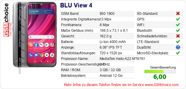Hast du eigene Webseite? Willst du die Informationen über Standarddaten des Handys BLU View 4 irgendwo veröffentlichen? Das ist sehr einfach. Du kannst das Bild herunterladen oder kopieren und auf der Webseite folgenden Code hinzufügen:Das Einfügen von diesem Code verursacht das Anzeigen von dem folgenden Bild: