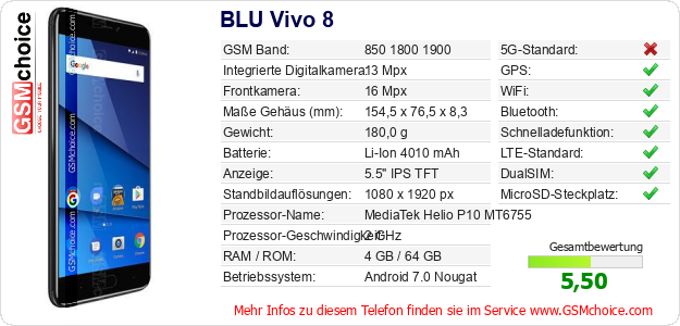 Hast du eigene Webseite? Willst du die Informationen über Standarddaten des Handys BLU Vivo 8 irgendwo veröffentlichen? Das ist sehr einfach. Du kannst das Bild herunterladen oder kopieren und auf der Webseite folgenden Code hinzufügen:Das Einfügen von diesem Code verursacht das Anzeigen von dem folgenden Bild: